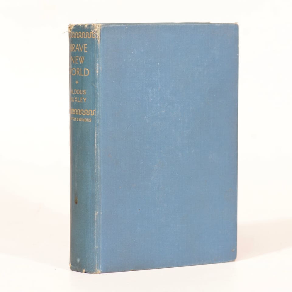 Brave New World was Huxley’s fifth novel and first dystopian work inspired by the utopian novels of H. G. Wells. Previous owner’s name on the front fep with some transfer to the facing A lean to the spine. A small stain mark to the page edges from Pg 56 – 61. 306 Pages. Contents clean and binding firm. First Edition. Condition: Good. No dust jacket. Binding: Hardcover. Blue cloth boards. Small nicks with a 1cm splint to the cloth edges of the spine. Some edge-wear to the corners.