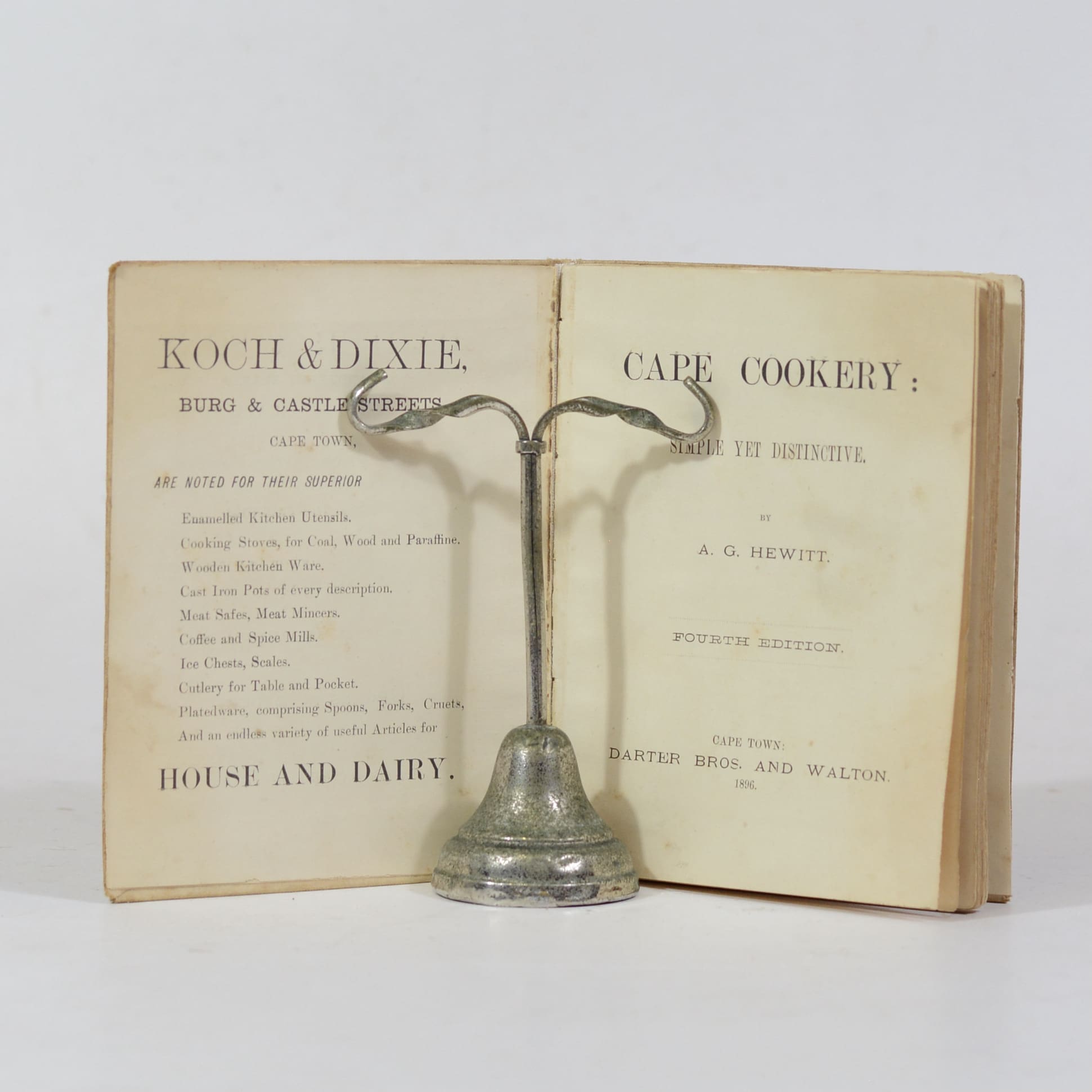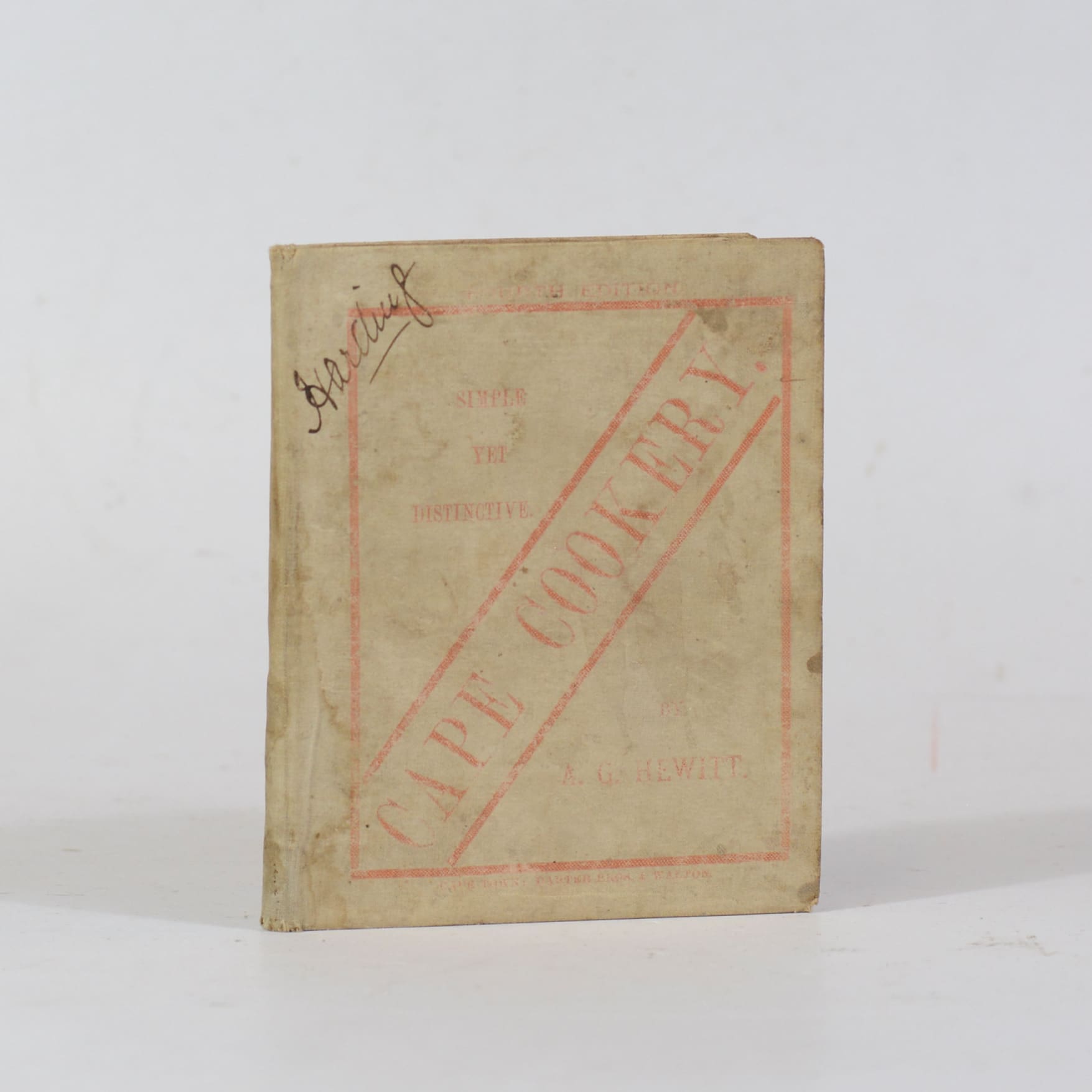 Originally published in 1889, this is a scarce fourth edition of what is considered to be the first book on true “Cape Cookery.” The Author’s Note states: “This little Book is simply what it professes to be, a collection of Cape dishes from original recipes. In the palmy days, when Indians visited the Colony, Cape cookery enjoyed a reputation which it has now almost entirely lost through the competition of more pretentious French dishes. But it is believed that there are still many households which would gladly welcome a handy collection of really good old-fashioned recipes, such as were almost traditional among the better classes of Cape society in former times. For them this book is intended. A.G.H. Cape Town, May 1890.” “When he (Leipoldt) discusses A.G. Hewitt‟s Cape Cookery, published in 1889,that it is the “first accurate account of local recipes” (Leipoldt 2004: 23), the book‟s chapters on fish, especially, point to Cape Malay cooking: “smoored kreef” (smothered or stewed crayfish), “ingelegde vis” (curried pickled fish) and “smoored snoek” (smothered or stewed fish) while later chapters in Hewitt‟s book describe the recipes for bobotie, Cape curry and Cape chutney – even the absence of recipes that could include wine, which Leipoldt criticises the book for, emphasise a local, Eastern tendency.” Ref: Oppelt, Riaan, C. Louis Leipoldt and the Role of the “Cape Malay” in South African Cookery. Journal of Literary Studies 28(1): 51-68 – March 2012. Advertisement for the very South African Cartwright’s Curry Powder to the rear board. Somewhat worn and stained with a previous owner’s signature to the the upper front board. Contemporary gift inscription to the author’s note page. A few spots to the recipe pages. A very good copy of an early edition of this scarce work. 100 pages. Fourth Edition. Condition: Good to very good. Binding: Hardcover. Cream cloth boards with red titles to front and rear.