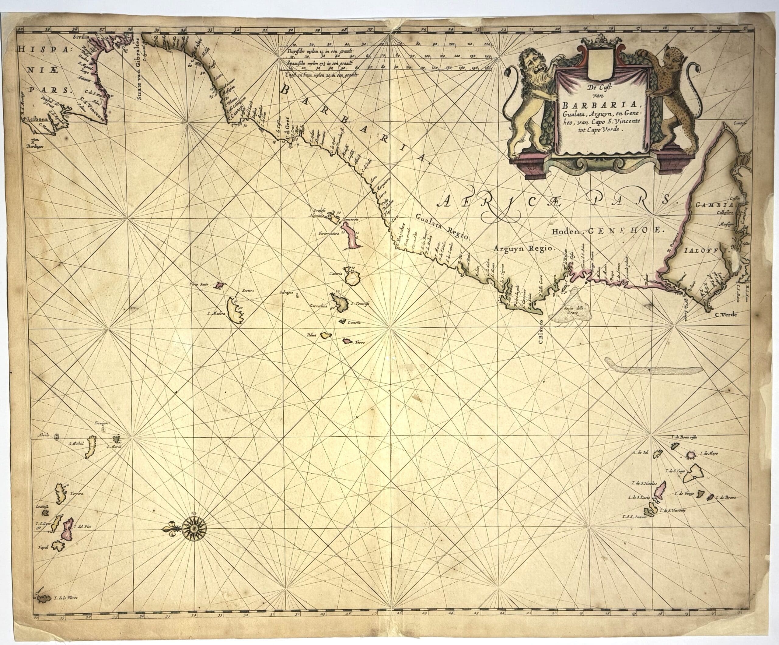 Copperplate engraving, hand coloured. This sea chart by Pieter Goos, De Cust van Barbara, Gualata, Arguyn, en Gene, represents a detailed portion of the northwest coast of Africa, focusing on the Saharan and Mauritanian littoral. It covers the coastline from roughly Cape Bojador (Barbary Coast) southward through Gualata (Walata), Arguin, and Gene (Senegal region)—an area of strategic importance to early modern European maritime powers, particularly in the context of trade with West Africa. Published in Goos’s Zee-Atlas ofte Water-Wereld, a lavish maritime atlas designed for both practical and commercial use by ship captains and merchants of the Dutch Republic. It is a rare example of early cartographic attention to a region more often passed over in favour of better-known parts of the West African coast. Condition: Good. Short tears to margins and some chipping to edges almost entirely outside the platemark. Professionally repaired with Japanese tissue. Geographic Scope and Detail: • Barbara refers to the Barbary Coast, encompassing parts of present-day Western Sahara and southern Morocco. • Gualata (Walata) is represented in a coastal context, though the historic city lies inland—suggesting a confusion or conflation typical of European cartography of the interior during this era. • Arguin is prominently marked, including ĂŽle d’Arguin, a small island off the Mauritanian coast that was home to a series of trading posts and forts contested by the Portuguese, Dutch, and later the French. • Gene likely refers to the Senegalese coast, possibly derived from a local or Portuguese form of the Senegal River. • The coastline is delineated with notable attention to bays, shoals, inlets, and river mouths, though inland features are minimal or absent—typical of Dutch sea charts designed primarily for coastal navigation Navigational Features: • A network of rhumb lines radiates from a central compass rose, marking the thirty-two points of navigation used by European mariners. • The chart includes soundings, hazards, and anchorage points, particularly near the Arguin Bank—an area notorious for its shallow waters and shipwrecks. • The scale bar is rendered in Dutch, Spanish, and English nautical miles, facilitating international use. Decorative and Symbolic Elements: • The title cartouche is elaborately designed with baroque flourishes and maritime iconography. It may include allegorical figures representing Africa or references to local trade, such as gold and gum arabic. • A handful of Dutch ships under sail adorn the ocean, emphasising both the cartographic function and Dutch naval presence. • Sea monsters or stylised marine life may appear in the open sea areas, blending early modern symbolic art with navigational caution. Historical Context: The northwest African coast was a frontier of early European-African contact. The Dutch West India Company (WIC) established brief but significant control over portions of the coast, including Arguin, in competition with the Portuguese. The region was rich in resources such as gold, slaves, salt, and gum arabic, and served as a stopping point for ships bound further south. Goos’s attention to this lesser-charted region reflects the ambitions of Dutch merchants and explorers to expand into under-mapped zones of commercial interest. This map would have been a vital navigational aid for WIC vessels and other European ships operating in the region.