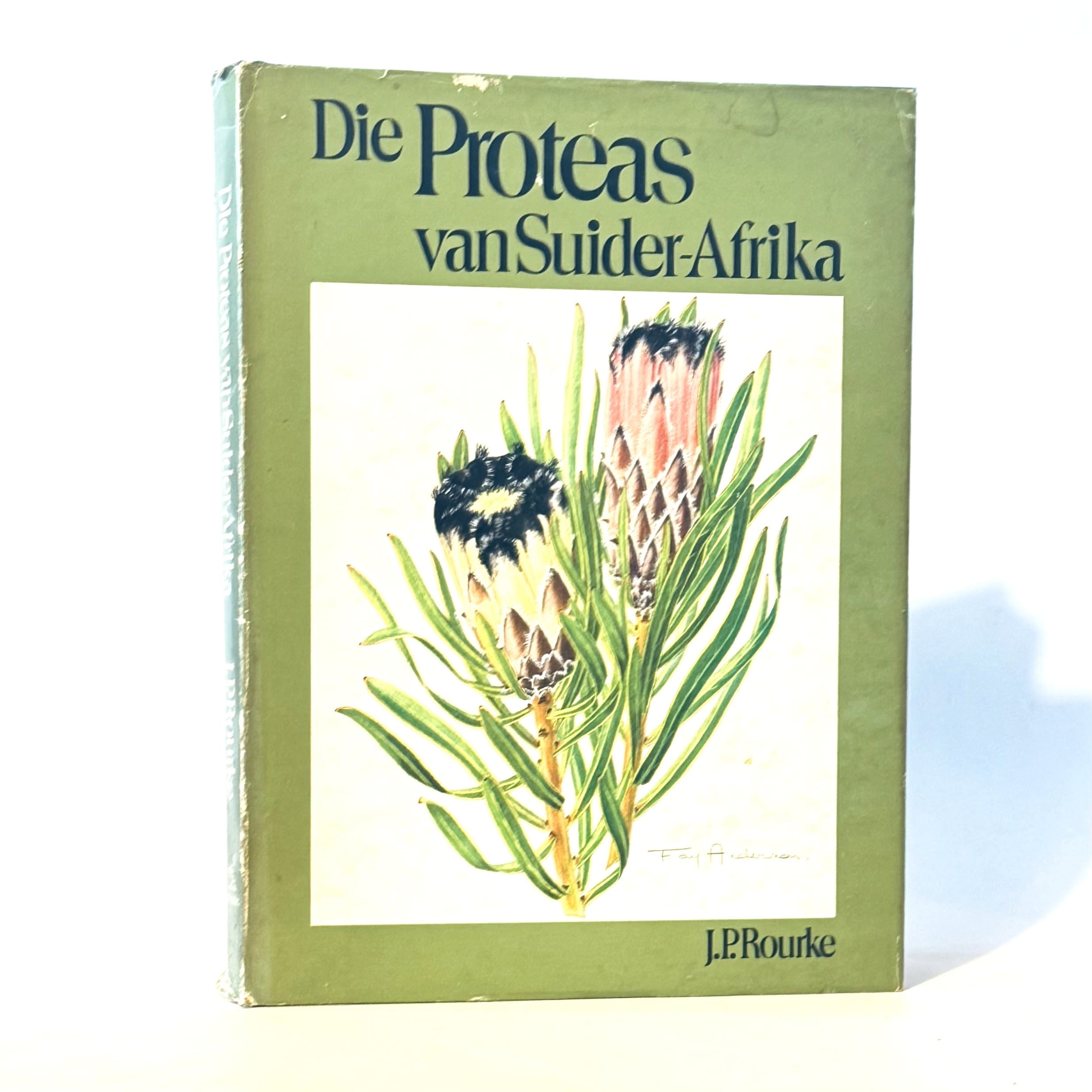 Text: Afrikaans. Approximately 90 colour plates of illustrations of the various proteacea. All the protea species occurring in Southern Africa described in full scientific detail with additional information on distribution, habitat and cultivation, together with historical background. Dust jacket: Edge-wear to extremities. Some creasing and abrasions to the folds. Two scratches with three small circular discourations marks to the rear cover. Lacks a 1.5cm piece from the lower edge. Binding: Green faux leather boards with gilt in very good condition. 236 Pages. Contents clean and binding sound. First Afrikaans Edition. Condition: Very good. Dust jacket: Good. Binding: Hardcover. 440 Botanical Natural History