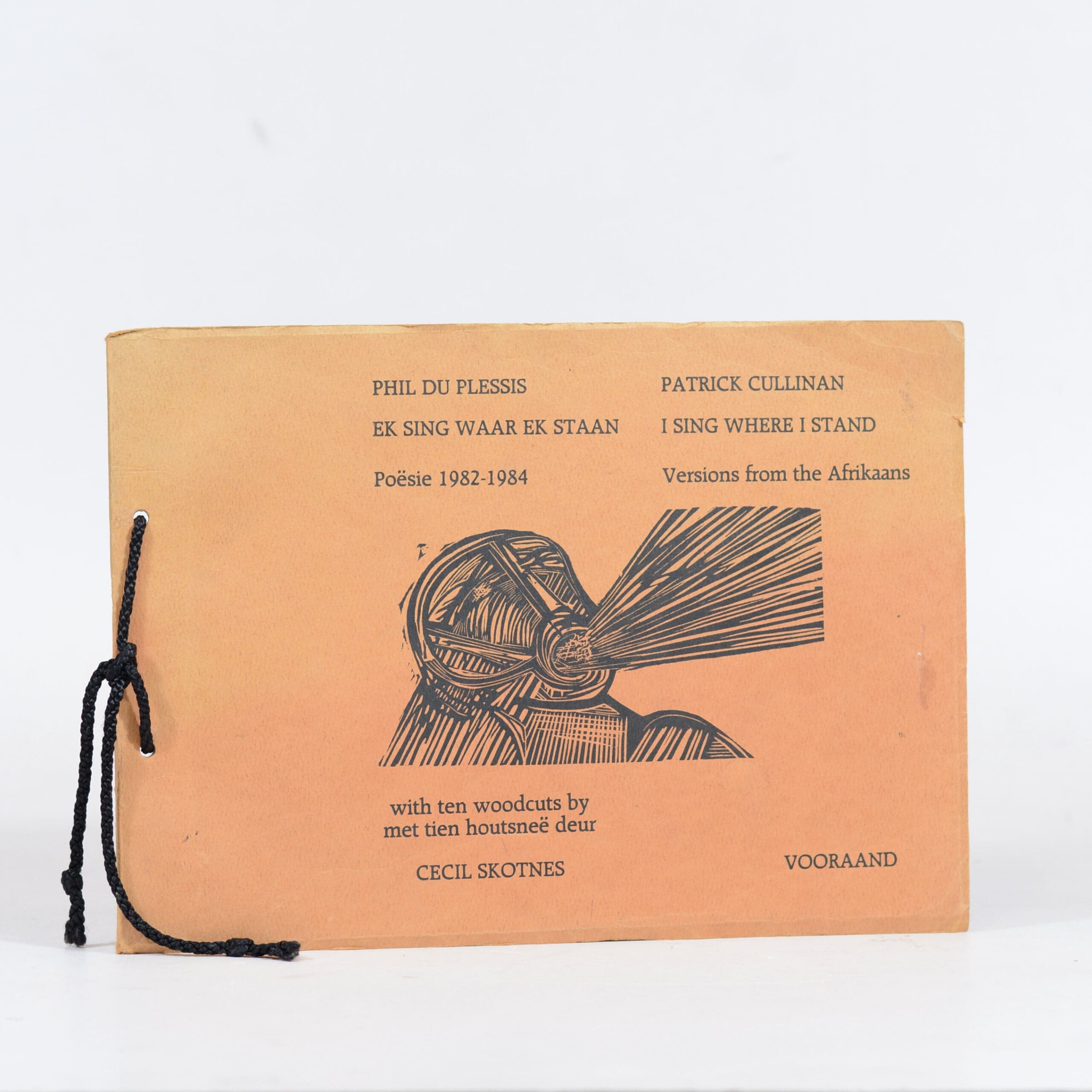 Afrikaans poetry by Phil du Plessis with versions in English by Patrick Cullinan. Accompanied by ten woodcuts by Cecil Skotness. No. 12 of 20 numbered copies, signed by du Plessis, Cullinan and Skotnes. Meant to accompany a portfolio with the 10 original woodcuts. Portfolio not present, woodcuts reproduced in litho and bound in orange card wraps, bound with black cord. Lightly faded and edge-worn. 1st Edition. Condition: Very good. Binding: Softcover.