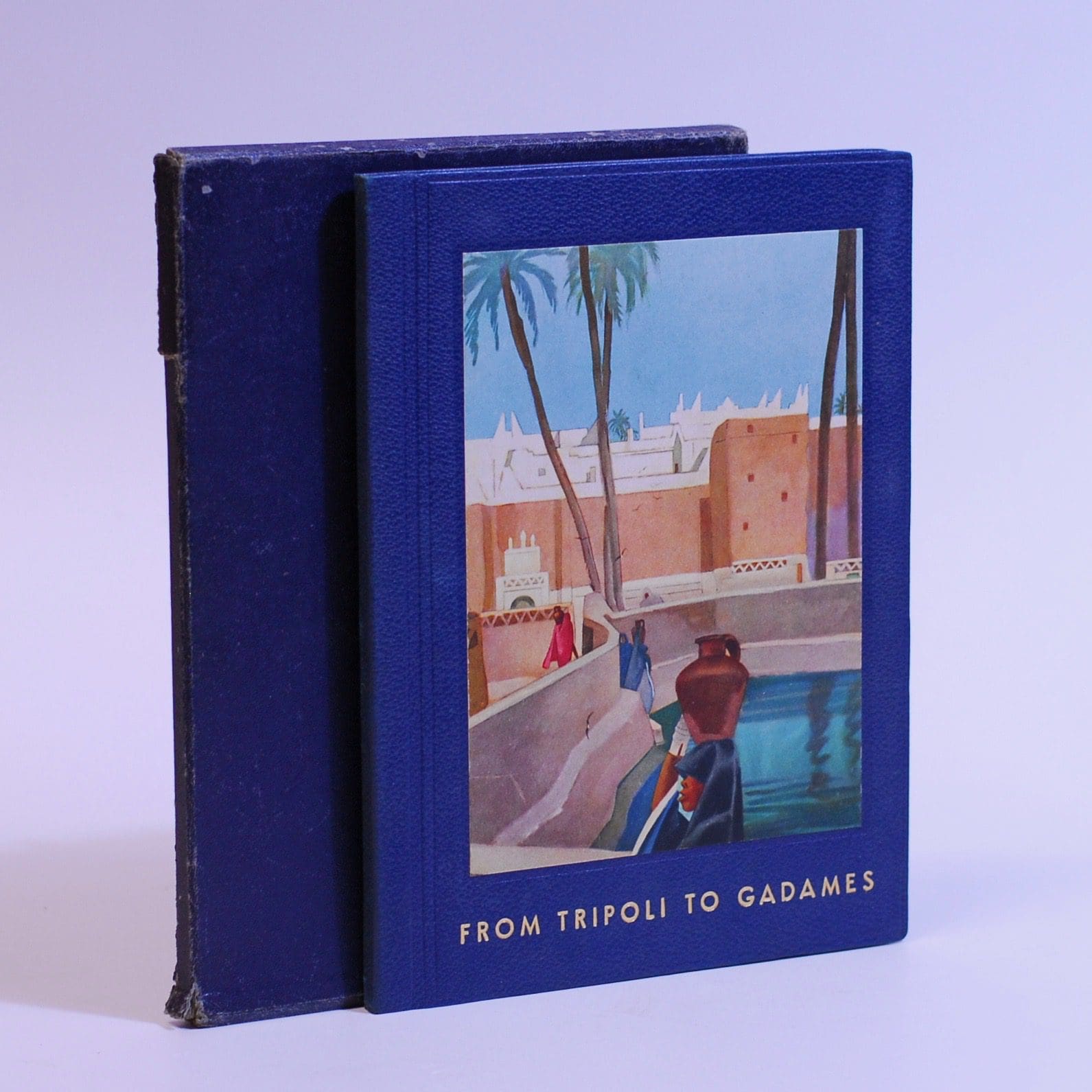 Slim book, pliant in leatherette cover with slipcase. A travel narrative. First English translation edition (1930). 17 beautiful art deco colour plates (including the plate on the cover, map, b/w photographs. The map has foxing on the verso with a 3cm open tear down the one fold. Foxing to the prelims, with a small mark on the first two free end pages. The slipcase has edge-wear, some abrasions to the boards and the top section of the spine has a 5cm split.