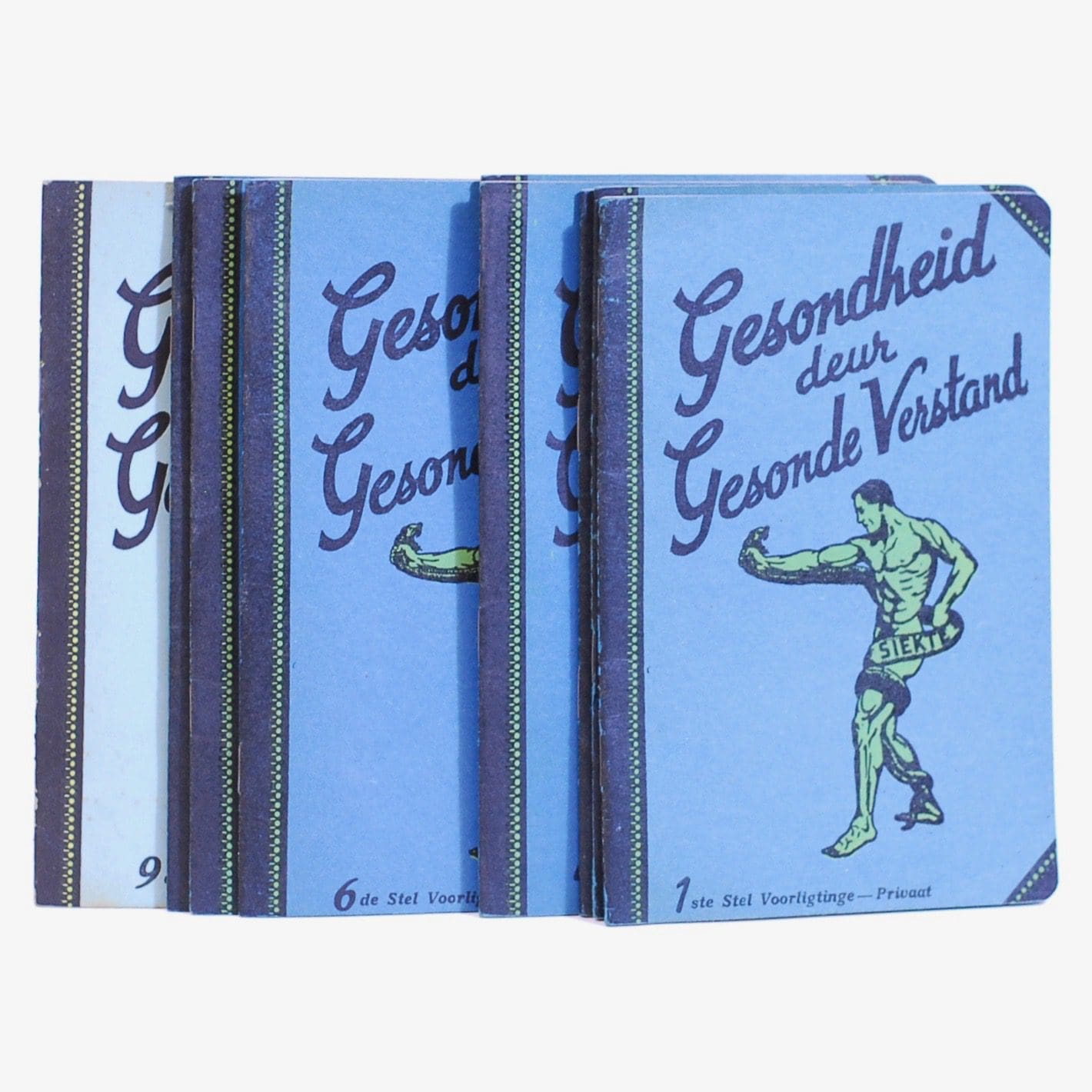 Text: Afrikaans. Die Tromp van Diggelen Instituut van Wetenskaplike Liggaamlike Ontwikkeling by the noted physical fitness author. Complete set of the 9 booklets. Scattered foxing in the booklets. The 9th booklet has sunning to the covers. Some light signs of insect damage to a few pages. A few photographs and illustrations are included in the booklets.