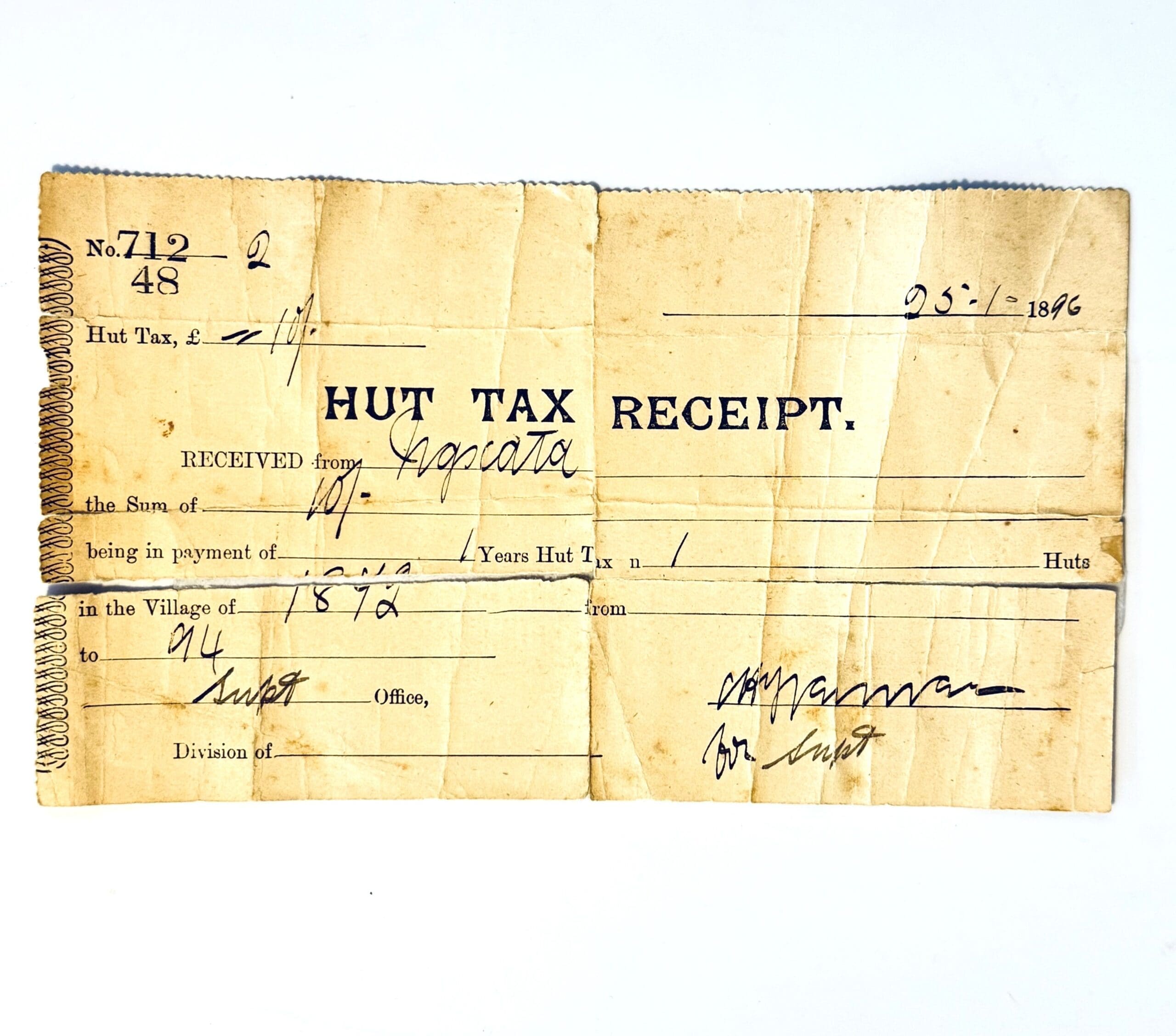 A hut tax was a type of taxation introduced by the British in Africa on a per hut or household basis as a means to raise funds.. Tears reinforced with clear tape. Condition: Fair.