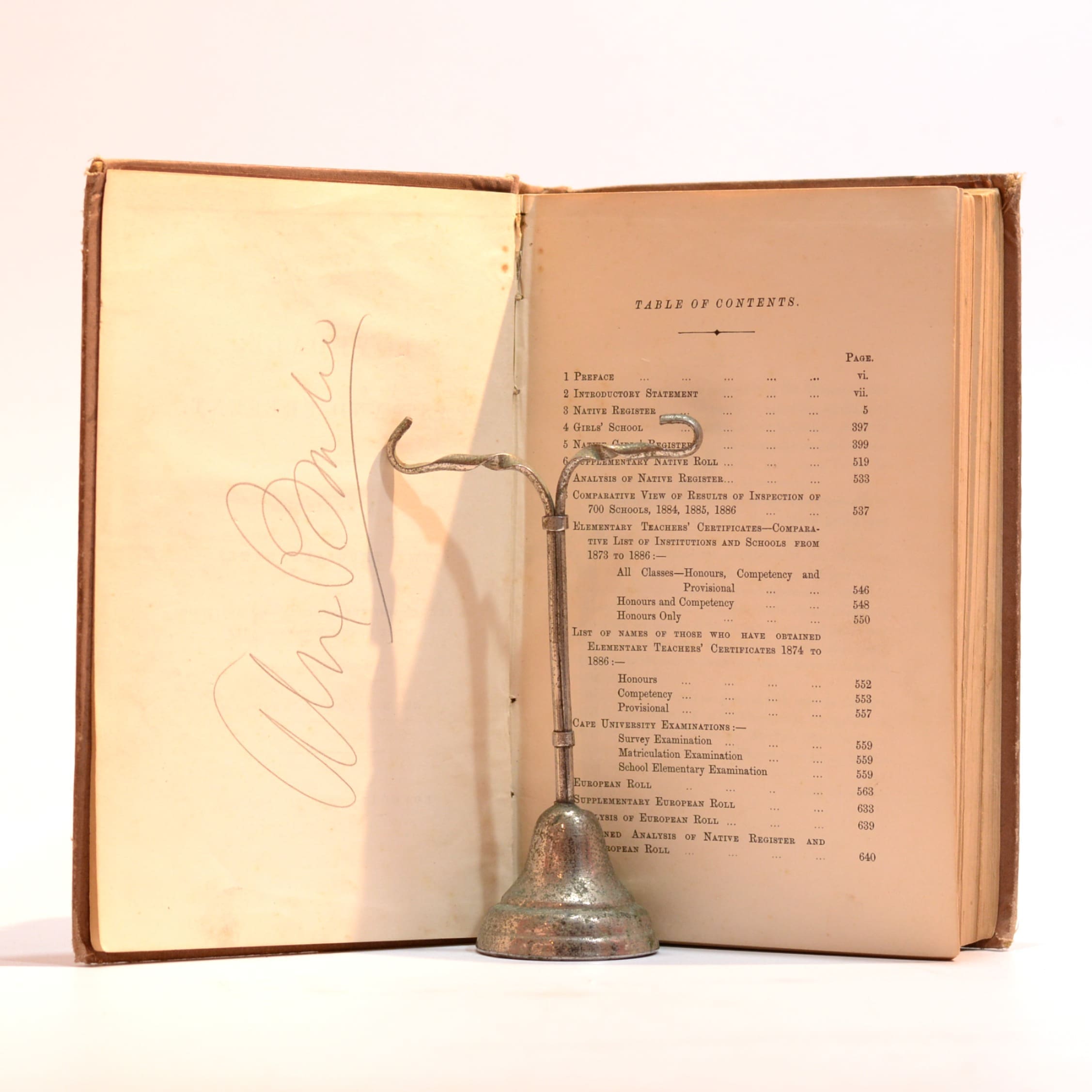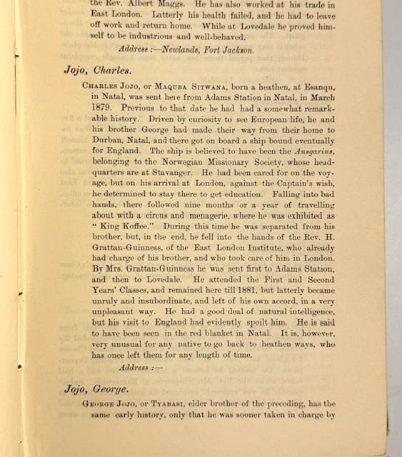 In addition: “Analysis of foregoing Lovedale Register” showing subsequent statements of employment of “Native Young Men” and “Native Young Women”, and other statistics related to the progress of students after leaving Lovedale. “A reply to the increasing attacks on ‘liberal’ education for Africans” James Stewart (1831-1905), principal of Lovedale Missionary Institution. “In the following pages we have accordingly endeavoured… to give individual records of over 2000 natives of South Africa… and also some of the hundreds of Europeans… who have come for instruction to this place.” (from the Introductory Statement.) Despite Stewart’s words “It is a simple record of facts so far as we have been able to ascertain them, in whatever may be the judgment passed upon its contents. “The successes and failures of its students such as Tiyo Soga, John Knox Bokwe, Walter E. Stanford, John Tengo Jabavu, make for absorbing reading. Charles Jojo, or Maquba Sitwana, born a heathen, at Esangu, in Natal, was sent here from Adams Station in Natal, in March 1879. Previous to that date he had had a somewhat remarkable history. Driven by curiosity to see European life, he and his brother George had made their way from their home to Durban, Natal, and there got on board a ship bound eventually for England. The ship is believed to have been the ‘Ansgarius’, belonging to the Norwegian Missionary Society, whose headquarters are at Stavanger. He had been cared for on the voyage, but on his arrival at London, against the Captain’s wish, he determined to stay there to get education. Falling into bad hands, there followed nine months or a year of travelling about with a circus and menagerie, where he was exhibited as “King Koffee.” During this time he was separated from his brother, but, in the end, he fell into the hands of the Rev. H Grattan-Guinness, of the East London Institute, who already had charge of his brother, and who took care of him in London. By Mrs Grattan-Guinness he was sent first to Adams Station, and then to Lovedale. He attended the First and Second Years’ Classes, and remained here till 1881, but latterly became unruly and insubordinate, and left of his own accord, in a very unpleasant way. He had a good deal of natural intelligence, but his visit to England had evidently spoilt him. He is said to have been seen in the red blanket in Natal. It is, however, very unusual for any native to go back to heathen ways, who has once left them for any length of time. See the third image of the entry for Jojo Charles from pg. 103. Lovedale seminary and collage developed out of the Missionary Station (founded 1824), provided education (primary, high school, technical, teacher training, theology, and nursing) to Black students, aiming to educate them to the same level as white students, which was rare for its time. Prominent alumni include many influential Black African leaders and intellectuals, including former South African President Thabo Mbeki, Black Consciousness Movement leader Steve Biko, activist Chris Hani, and the first black South African cleric, Tiyo Soga. 1st Edition Condition: Good. Binding: Hardcover. Cloth boards with edge-wear. Bumping to corners.