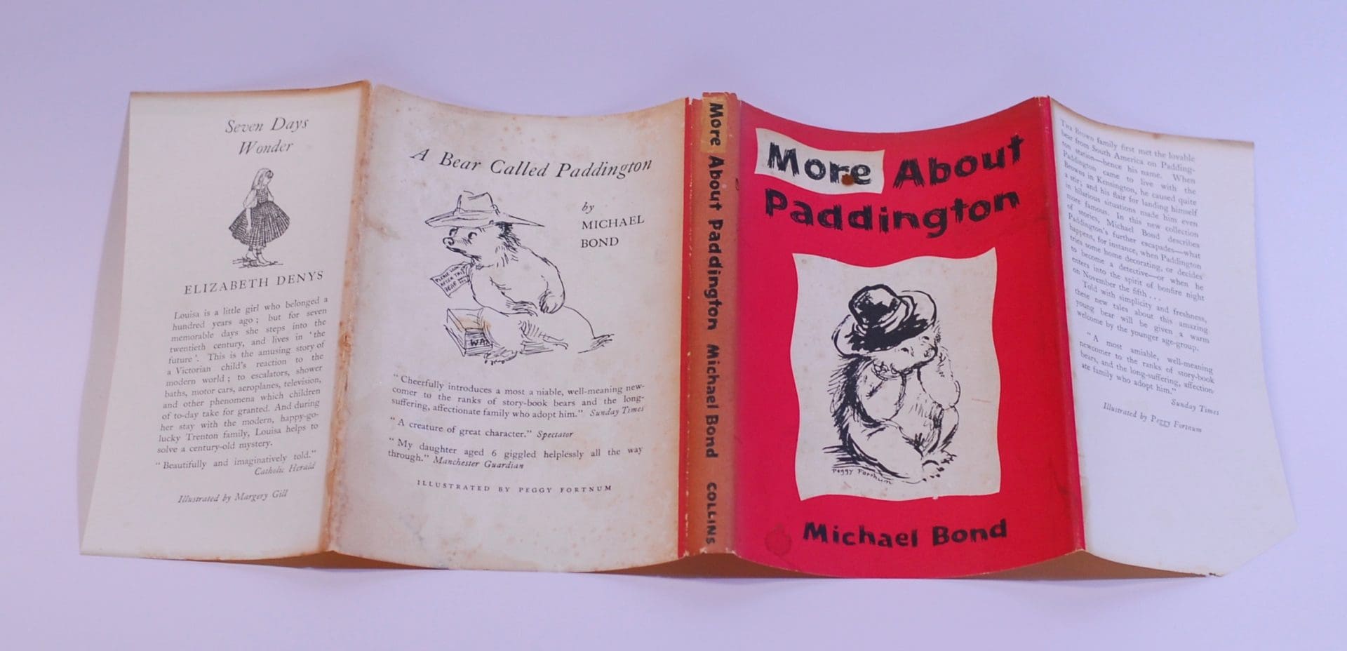 First edition of the second Paddington book. Green cloth boards with silver titles to the spine. Some age toning to the feps. Small burn hole to the front panel of the dust jacket that has also left a mark on the front board. The dust jacket has been price clipped. Some light foxing, age toning and soiling to the jacket.