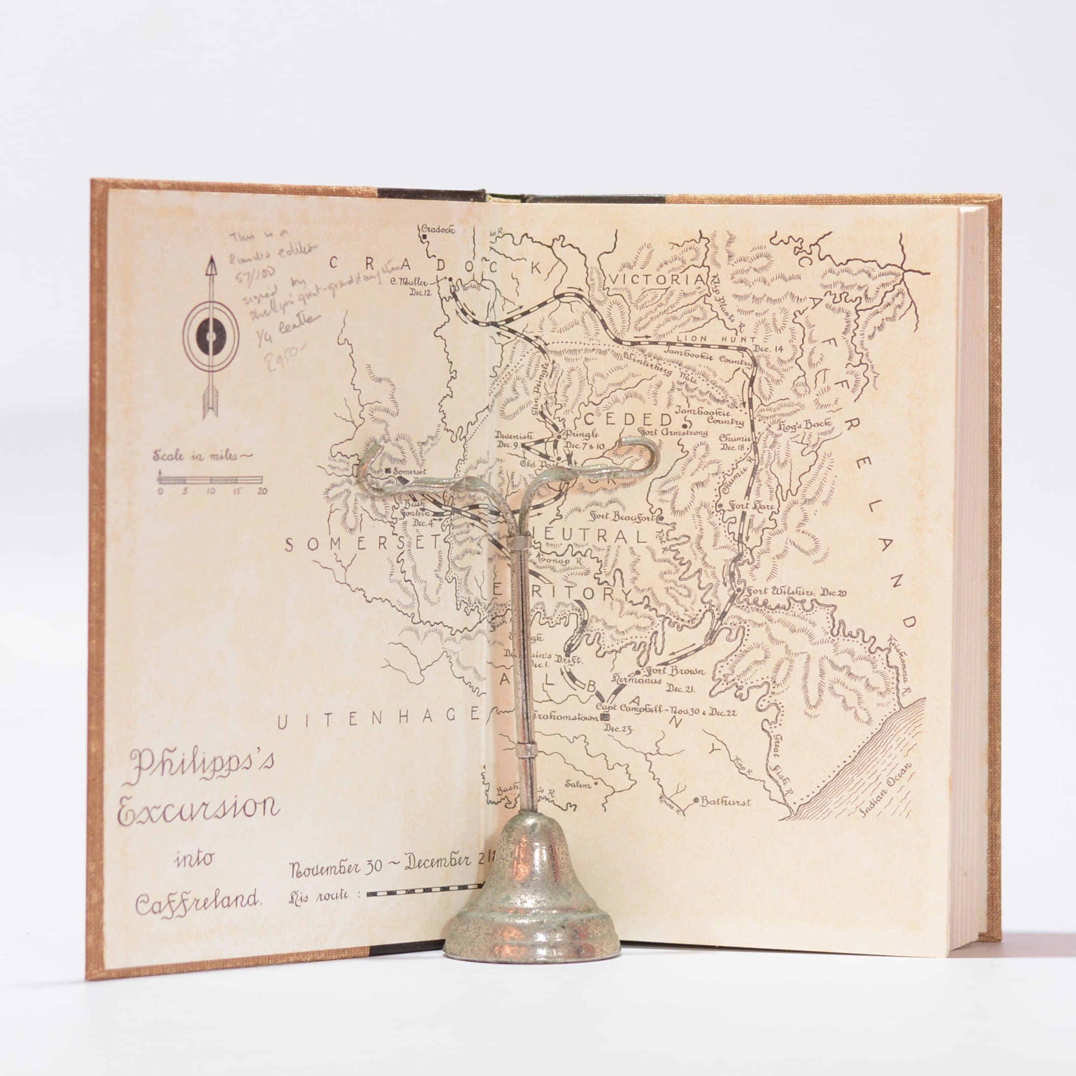No. 52/100 of a limited edition. Signed by Phillip’s great grand-daughter. From the jacket flap: “The adventures of an 1820 settler and his family with lively comments about the settlement as a whole and about many of the settlers.” Letters edited by the author in consultation with Philipps’ great-granddaughter, E K Heathcote. Two maps as end papers – Philipps’s excursion into Caffreland; General plan of the South Eastern part of the Albany district at the rear. Some mild foxing to fore-edges. Some toning and foxing to front and rear end papers. 371 Pages. Contents clean and binding tight. First Edition. Condition: Very good. Binding: Hardcover. Quarter leather. Cloth boards.