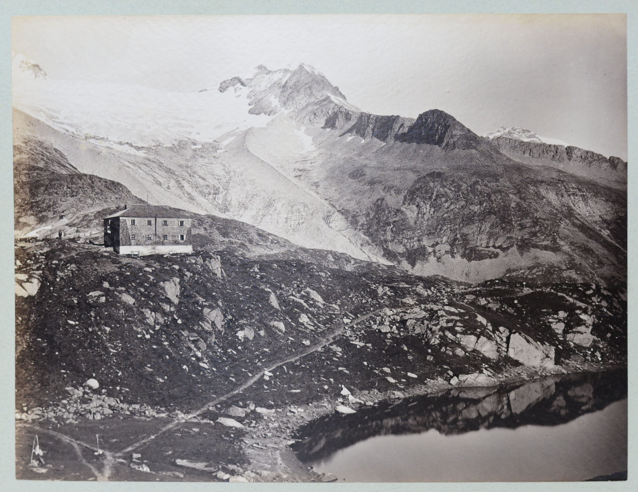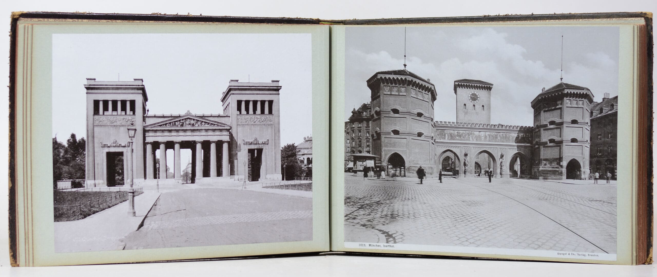 Forty sharp, clear original photographic prints. Twenty three are full page and seventeen are smaller (one to two per page). 5 of Munich initialled RJD and numbered in the negative – (Römmler und Jonas – Dresden). 22 x 28cm 2 of Munich titled ‘Munchen, Isathor’ and ‘Ludwigstrasse gegen das Siegesthor by SlĂ©ngel and Co.- Dresden with blindstamp dates 1897. 23 x 28cm. 4 Architectural views of Munich titled in the plate: Frauenkirche, Basilika Inneres, PropylaĂ«n and Bavaria m. Rushmeshalle. 20.5 s 26.8cm. 2 Alpine Lake views inscribed in the plate: F. Granier, Reichenhall 1898. 18.4 x 24.4cm. 6 Alpine photographs – mountains and glaciers. Two with hand written titles ‘Walzmann’ and ‘Zillertaler Alphen mit Berliner HĂĽtte’. 19.5 x 25.5cm. 1 view titled ‘Posen’ in the plate by Giorgio Sommer – Napoli. 20 x 25.5cm. 3 images titled ‘Rosengartengruppe vom Schlern’ aus.’ ‘Curort Merán’ and ‘Gilfanlange gegen SĂĽden’. 21 x 27.5cm. 17 smaller photographs – some with titles, ‘Frauen-insel – Chemsee’, Salzburg – Kapuzinergarten’, ‘Salzburg – Mozart’s Geburtshaus’, ‘ Obersee’, Meyerhofen’. 9.5 x 14.5cm. All photographs mounted to both sides of card album pages. Bound in a full leather padded binding with gilt titles to the front board and decorated endpapers.