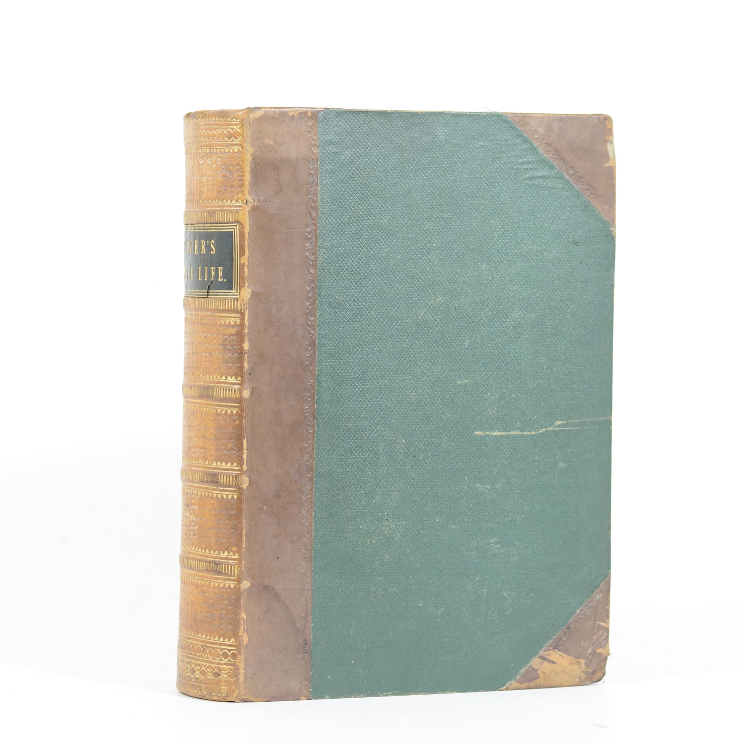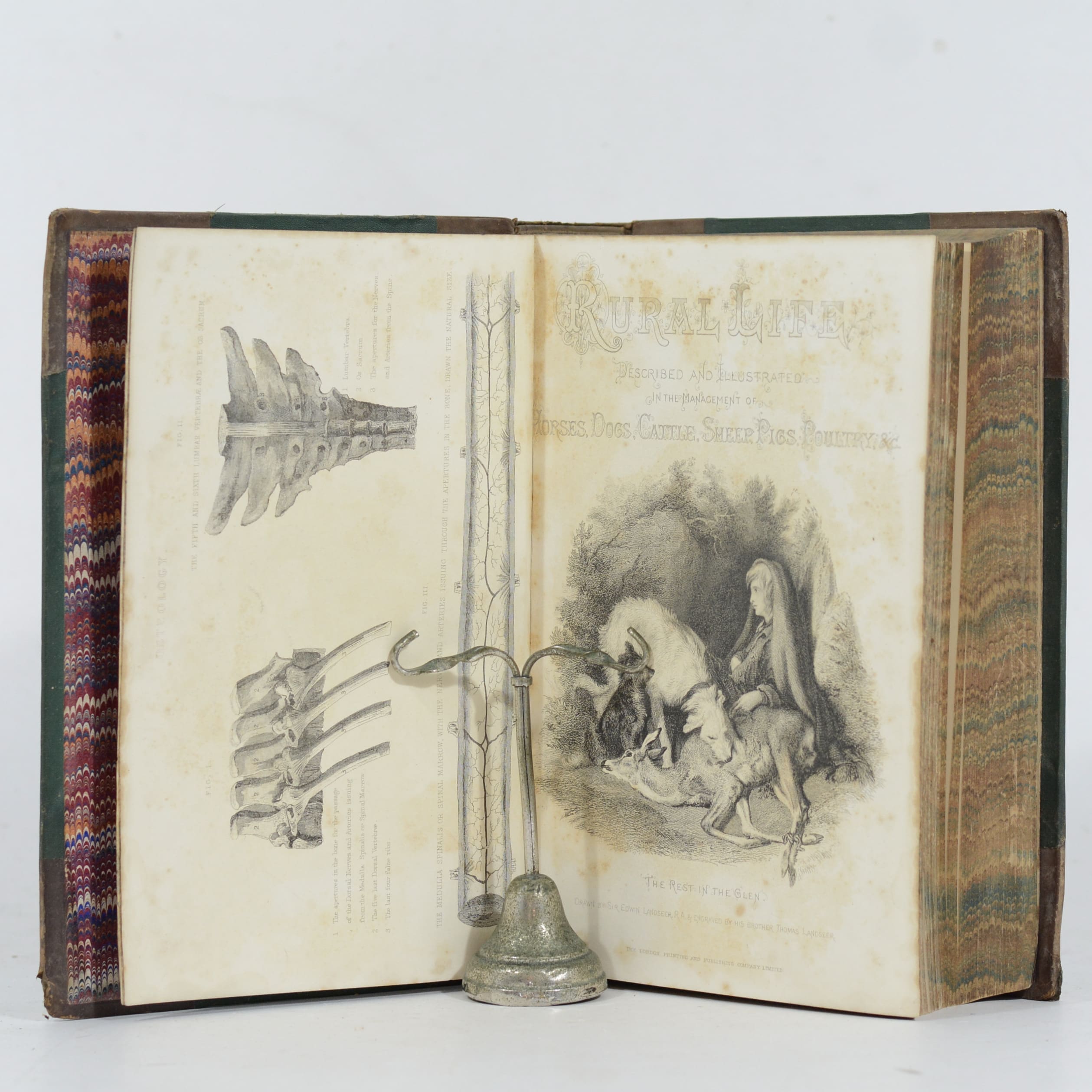 Includes authentic information on all that relates to modern farming, gardening, shooting, angling, and a complete system of modern veterinary practice. Over 100 steel engravings. Appears to lack Page 1/2. Includes a section of implements and machinery of English farming; Practice of Horticulture; and The Bee and the management of the apiary. Marbled end papers with marbling to all edges. Foxing to prelims and scattered throughout. 1016 pages. Binding sound. Condition: Good+. Binding: Hardcover. Cloth boards over half leather. Edge-wear to all extremities. Abrasions and bumping to corners and cloth. Rubbing.