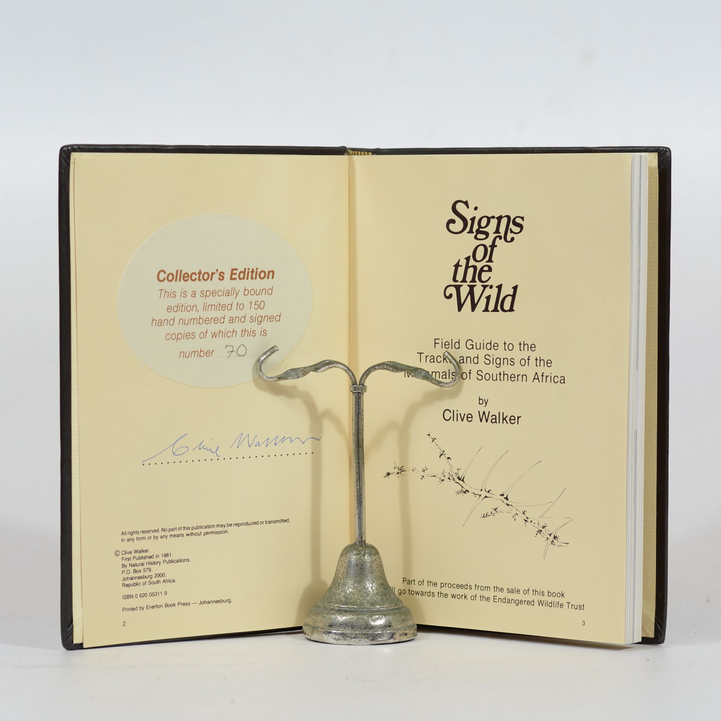 Specially bound collector’s edition, limited to 150 hand numbered and signed copies of which this is number 70. Field guide to the identification of southern African mammals based on spoor, dropings and other signs. Distribution maps for each of the animals species. Colour and b&w photographs. Also features skulls for each of the carnivores. Of interest for tracking and animal behaviour. Some light cockling to the lower edges of the pages. 223 pages. De Luxe Edition. Condition: Very good. Binding: Hardcover. Full dark brown calf. Some small indentations to the rear board.