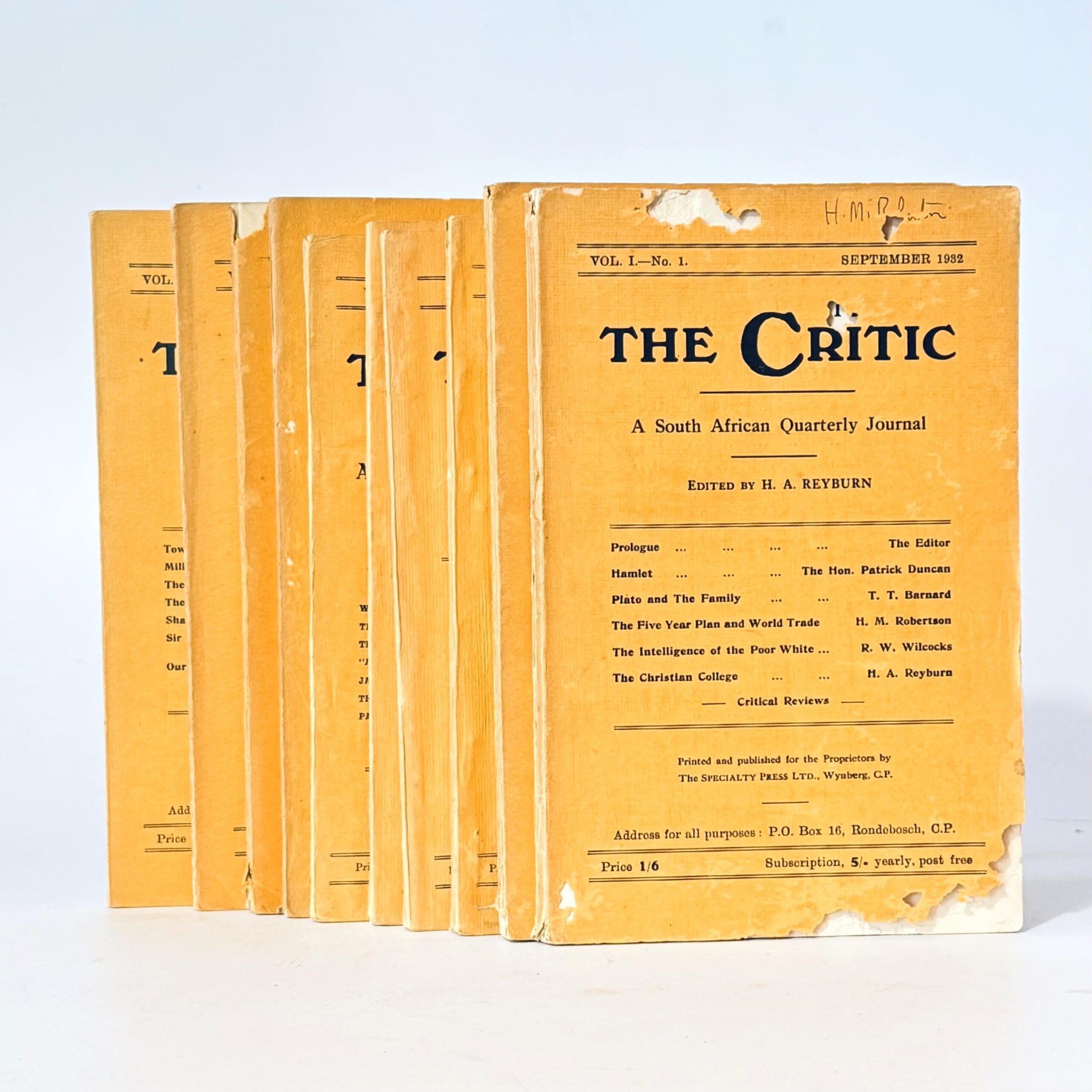 10 Volumes providing a space where South African writers and thinkers can discuss matters and set forth the conclusions they have reached. Vol I – No. 1, Sept 1932; Vol I – No. 3, March 1933; Vol I – No. 4, June 1933; Vol II – No. 1, September 1933; Vol II – No. 4, June 1934; Vol IV – No. 3, June 1936; Vol V – No. 2, 1937; Vol V – No. 3, April-June 1938; Vol V – No. 4, July-September 1938; Vol V – No. 5, 1939. Previous owner’s name on covers. Scattered insect nibbling to page edges. Foxing to top, fore- and lower edges. Condition: Fair. Binding: Softcover. Limp card-wraps. Insect damage to the covers of seven of the volumes. Abrasions to the spines. Lacks to head and foot of spine to a couple of the volumes.
