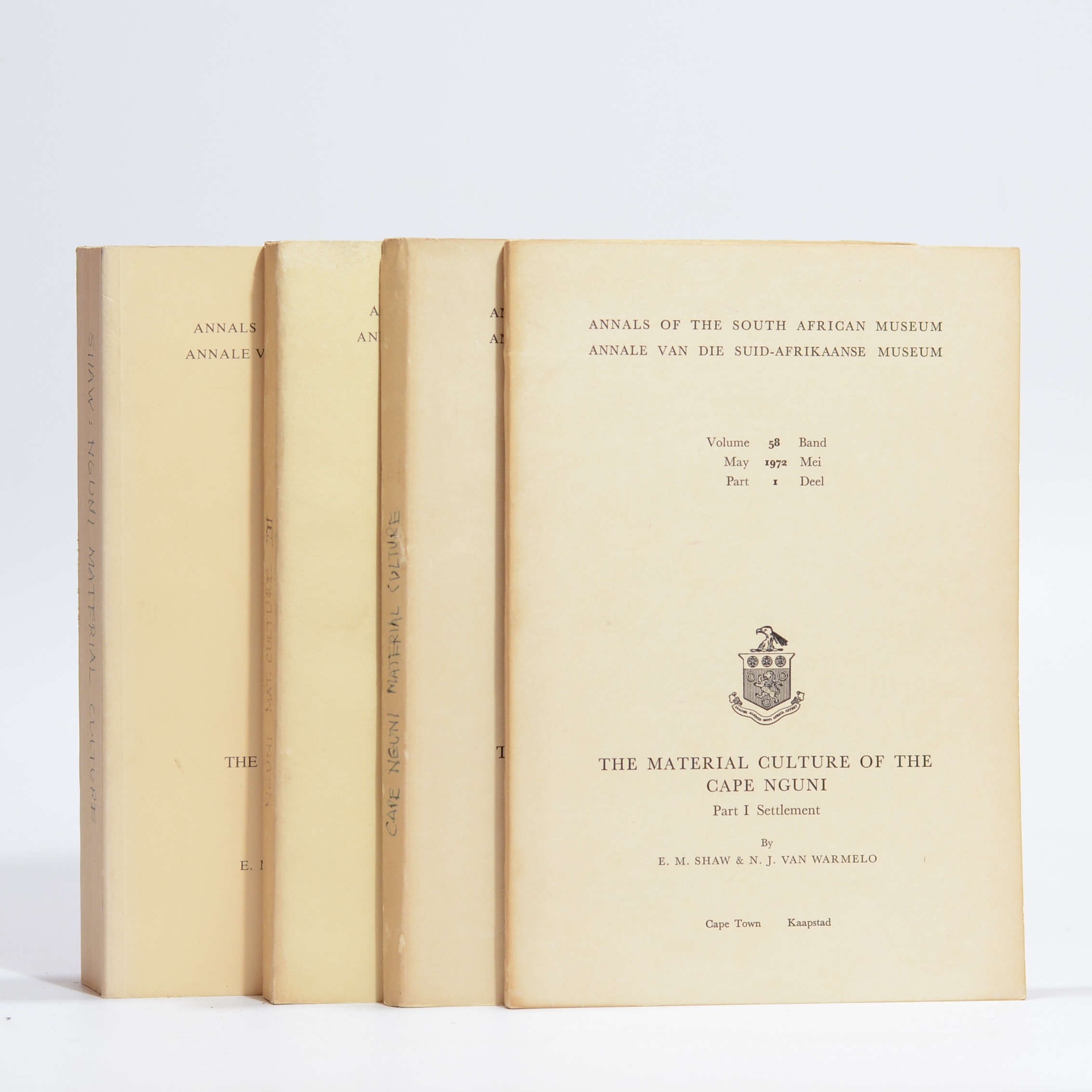 Forming volume 58, parts 1-4 of the Annals of the South African Museum. Part 1 Settlement (1972), part 2 Technology (1974), part 3 Subsistence (1981)and part 4 Personal and general (1988). 949 pp. Card wraps with toning and handwritten titles to the spines. An important study of the Xhosa speaking people who are thought to have inhabited the Eastern Cape (Transkei) since the late 16th century. Very good card wraps