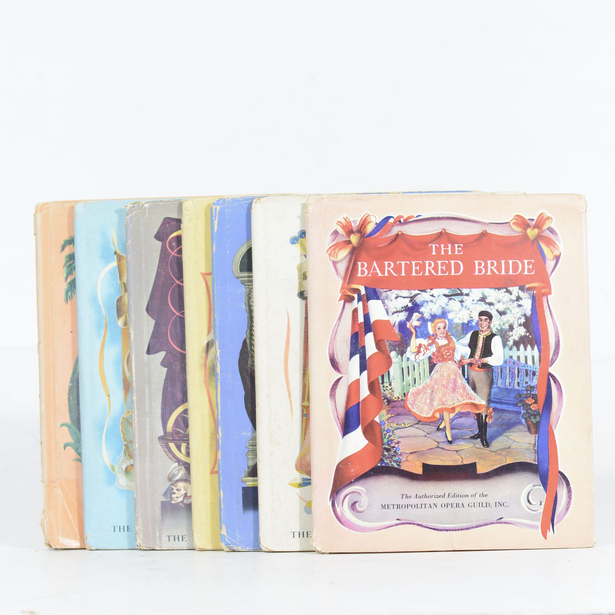 Each volume contains a vivid narrative of the opera’s story, interspersed with bits of the actual themes and arias. Beautiful colour and b&w scence by distinguished artists. All have patterned end papers. Closed and open tears, rubbing, some creasing, foxing and toning to the dust jackets. Previous owner’s name on front feps. Contents clean and binding firm. Condition: Good. Dust jacket: Fair to good. Binding: Hardcover. Illustrated boards. Edge-wear to all boards.