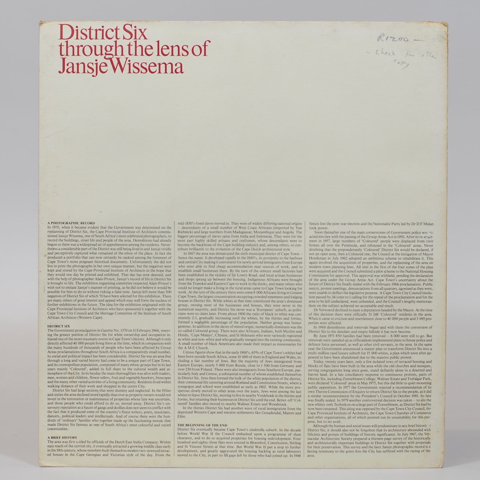 5 duotone prints of iconic images of District Six from an exhibition celebrating the work of Jansje Wissema. Prints are clean. Some foxing and handling marks to the covers. Cndition: Good. Binding: Softcover.