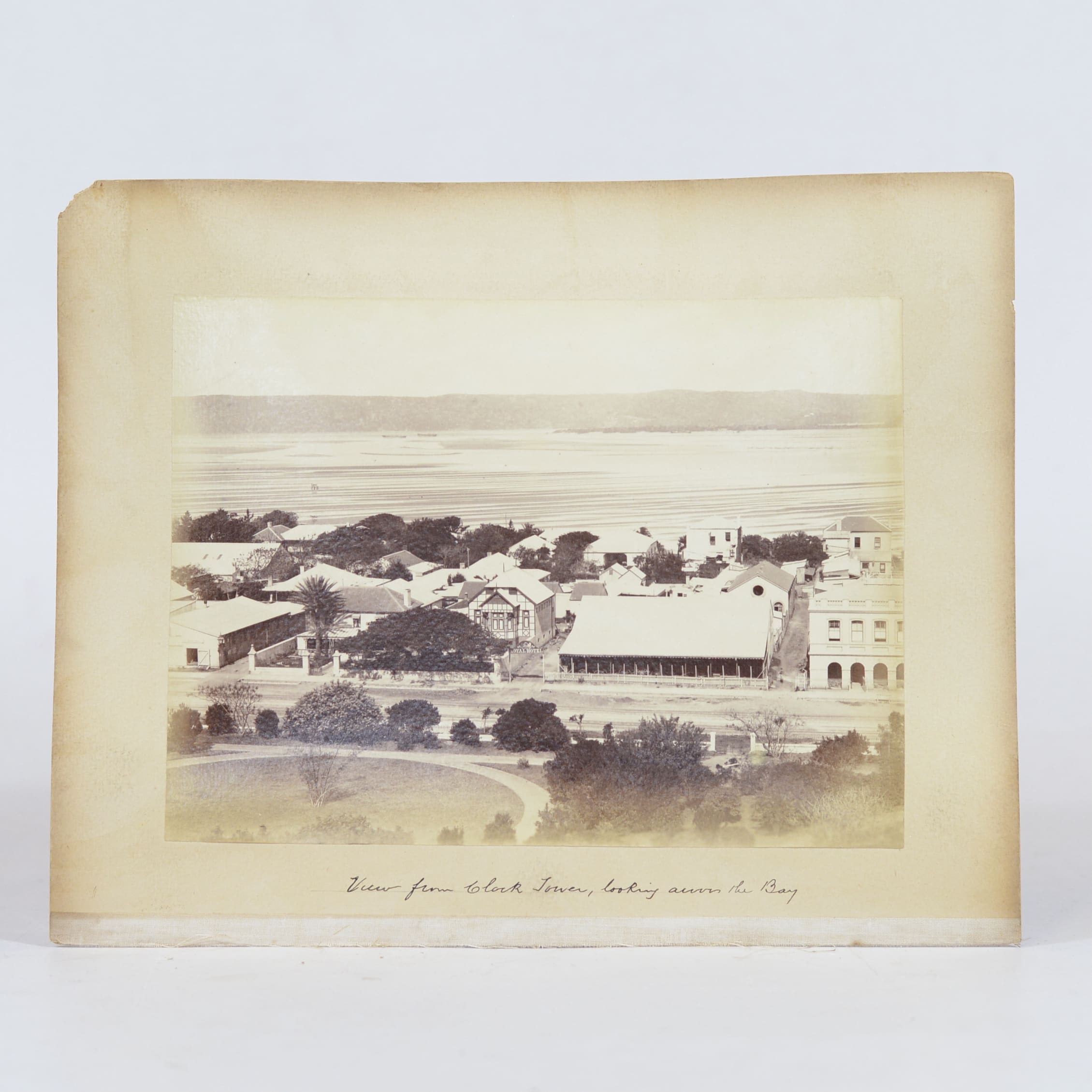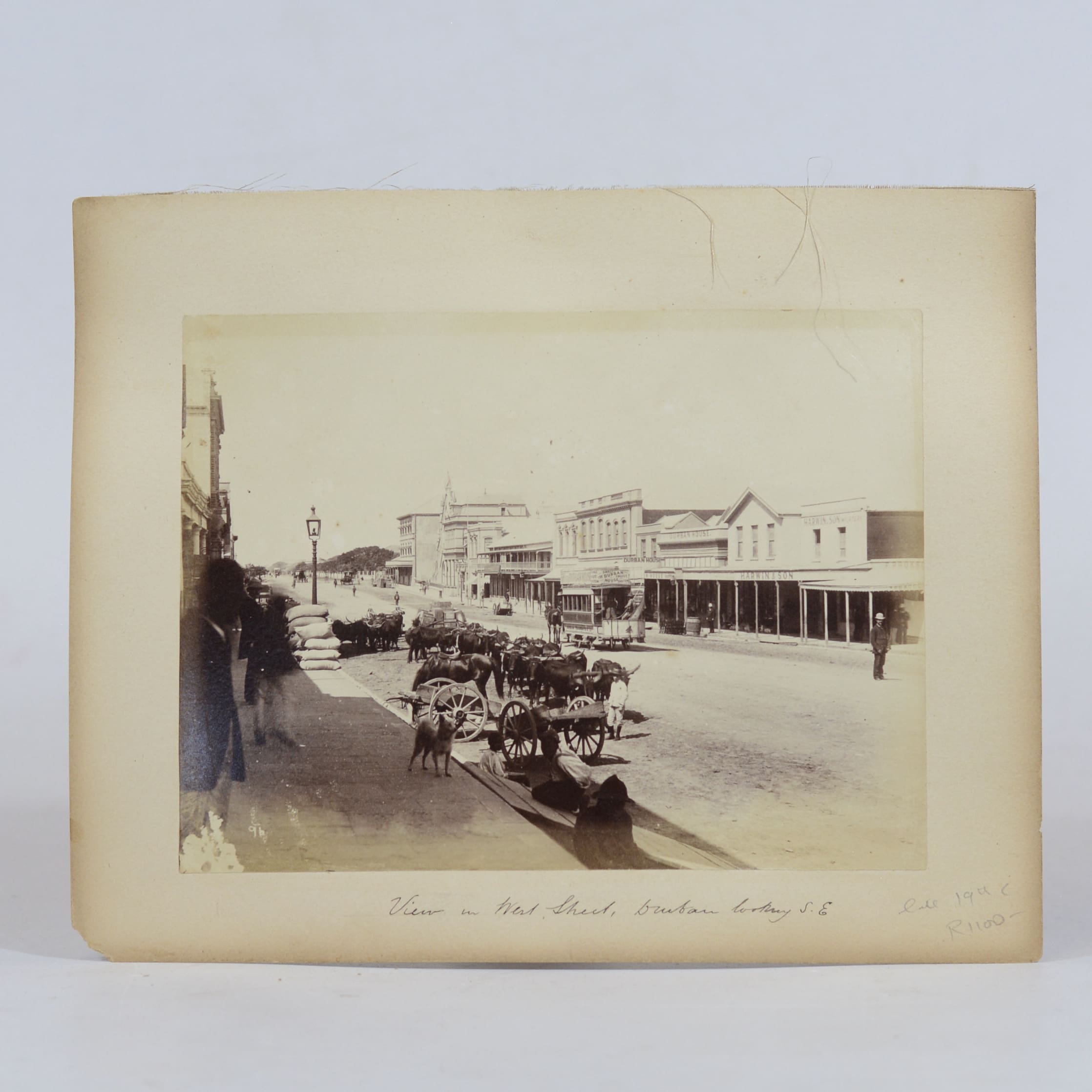 Two original photographs, back to back on an album card. Hand written titles. The card is cockled and chipped. Titled: “View from Clock Tower, looking over the Bay” with one of the houses being the “Royal Hotel” and “View in West Street Durban looking S.E.” Condition: Very good.