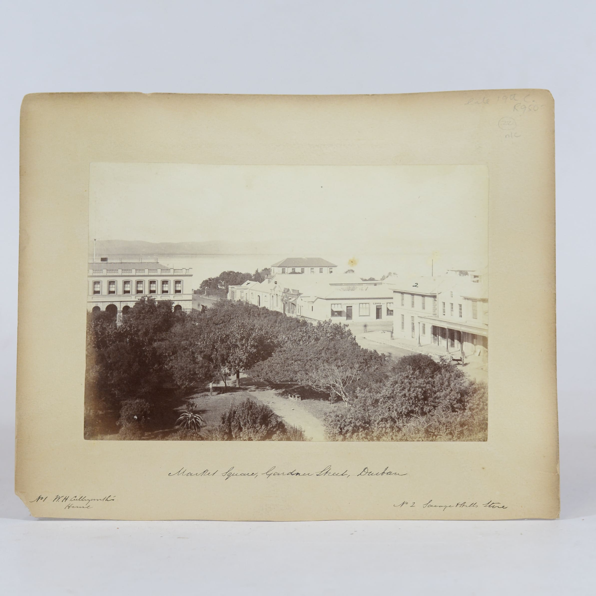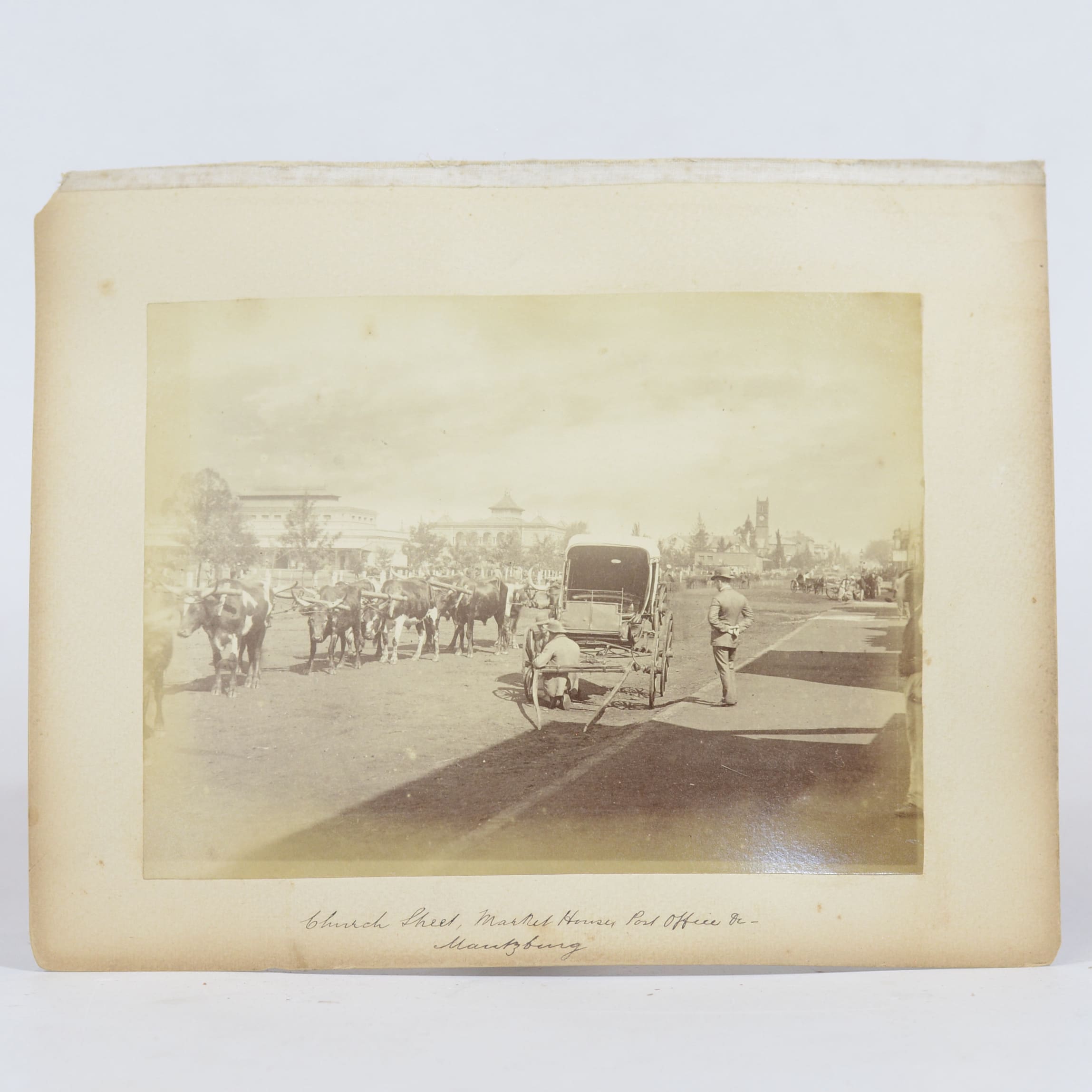 Two original photographs, back to back on an album card. Hand written titles. The card is cockled some light oxidation to one photo. Titled: “Market Square, Gardiner Street, Durban,(with1 being marked as W. H. Collingworth’s House and 2. Savavge + Hill Store.)” and “Church Street, Market House Post Office &c. Maritzburg.” Condition: Good.