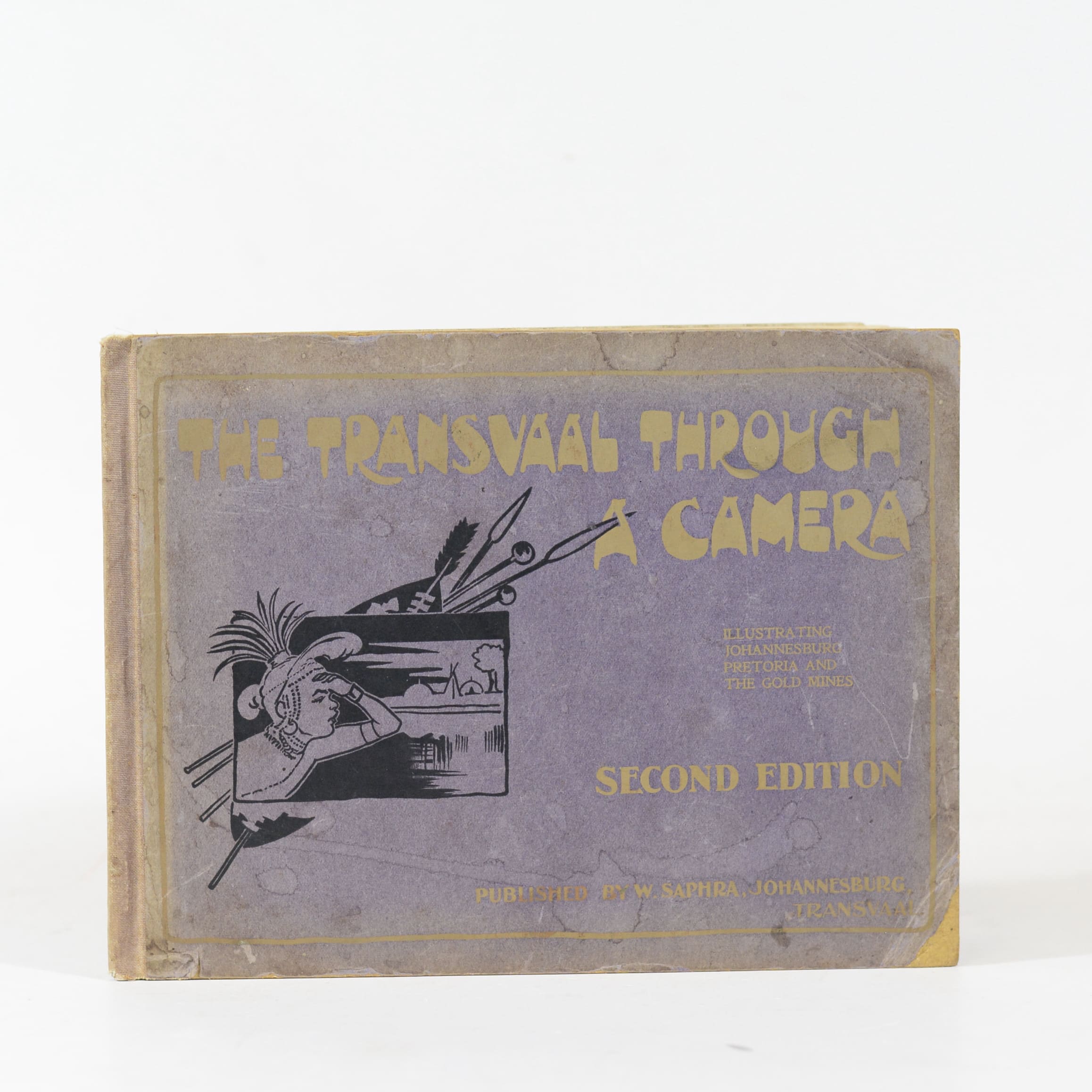The Transvaal through a camera illustrating Johannesburg, Pretoria and the gold mines. Patterned endpapers with inscription on front end paper. Contents clean and binding firm. 2nd Edition (Englarged). Condition: Fair to good. Binding: Hardcover. Cloth spine. Faded illustrated boards. Edge-wear to extremities. Corners worned and bumped. Sunning to boards. A couple of tide-marks.