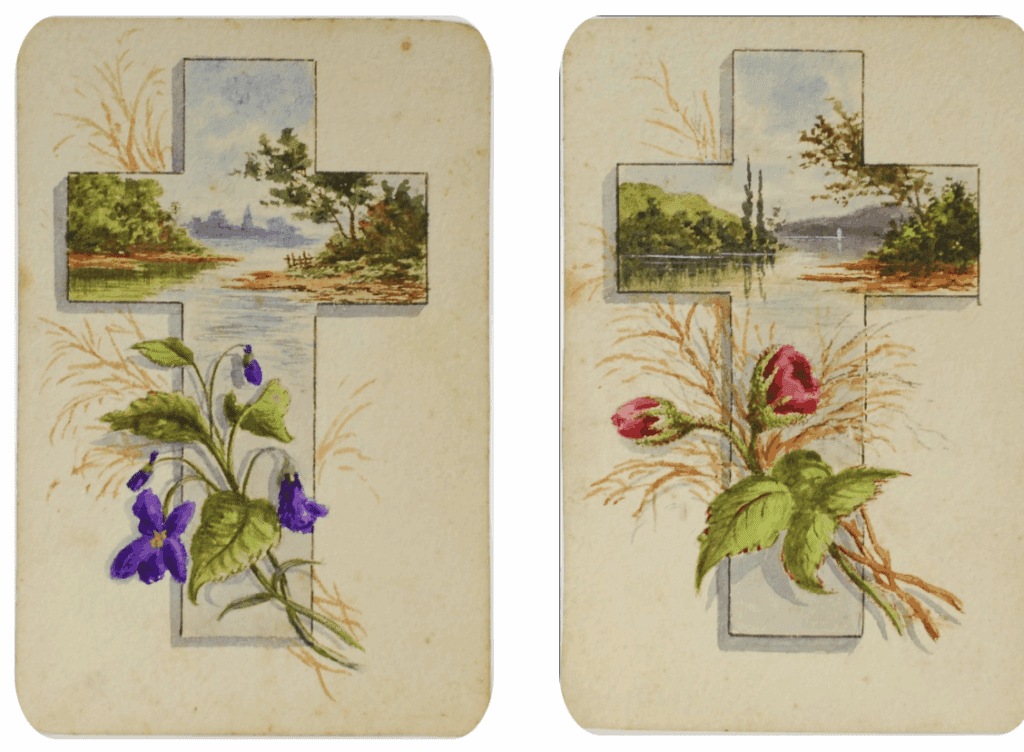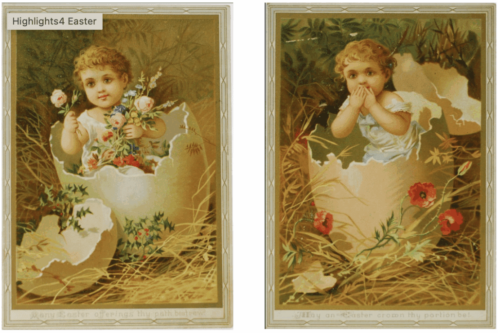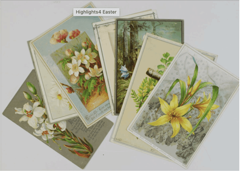 Two chromolithographed Easter greetings cards, ” Many Easter offerings thy path bestrew!” and “Many an Easter crown thy portion be!” 15 x 20cm, circa 1850.